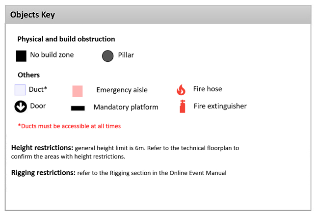 - Click on your Stand, you will find all dimensions, any build obstruction and height restrictions within your space which will be also shown on your Individual Stand Technical Plan